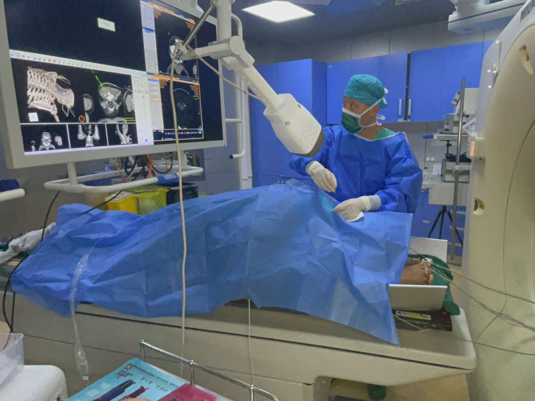 屏幕中呈现出在手术过程中医生操作的手术针的实时三维运动轨迹,及动态呈现针所在 CT 平面图像。点击了解更多...