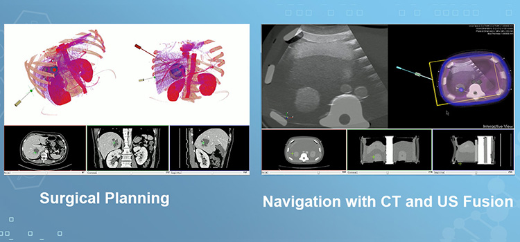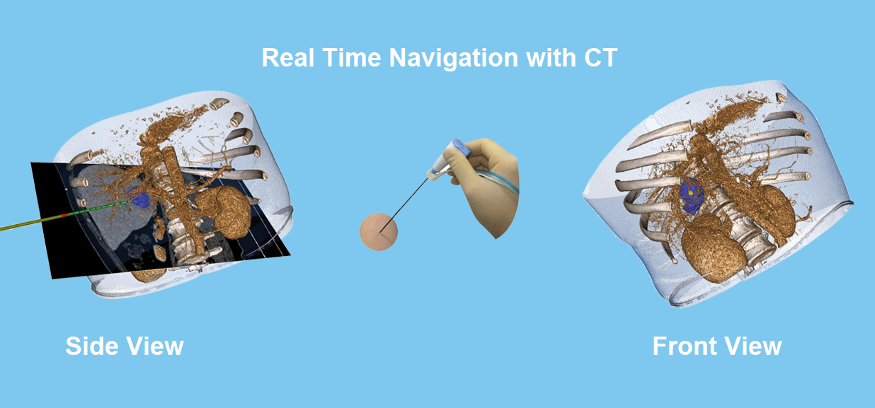 屏幕中呈现出CT 图像、超声图像以及虚拟的手术针,这三样东西一起显示在实时的 3D 空间中。点击了解更多...