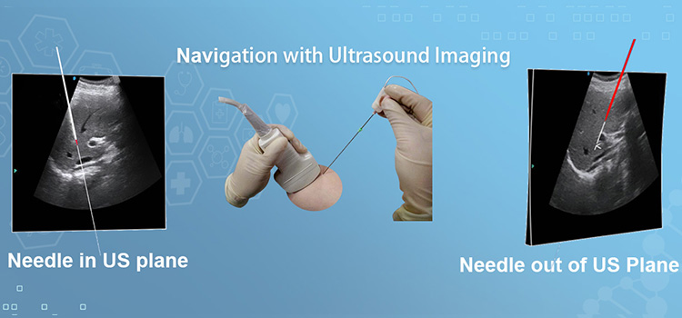 A tracked needle with respect to the ultrasound image in a 3D space displays com…
